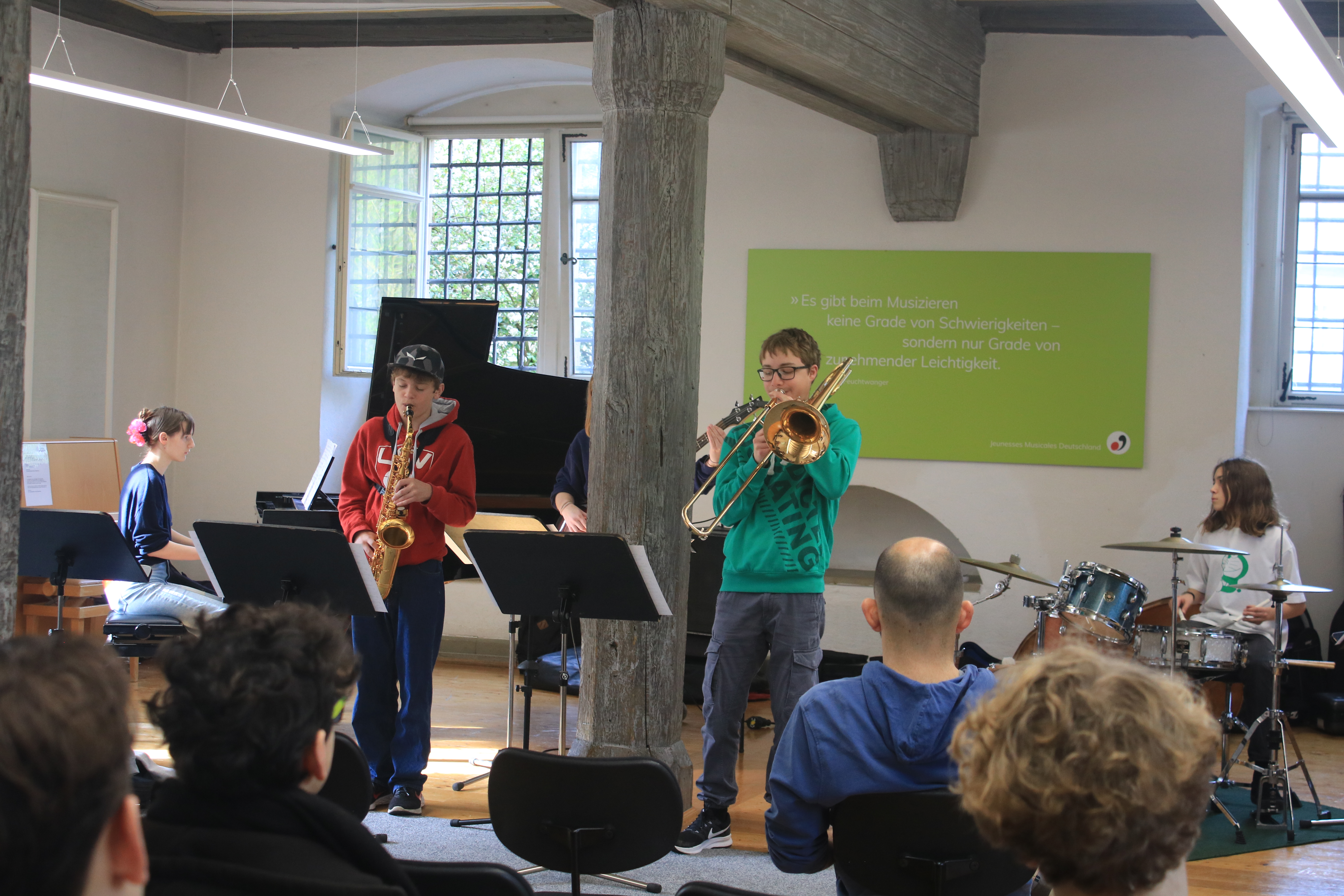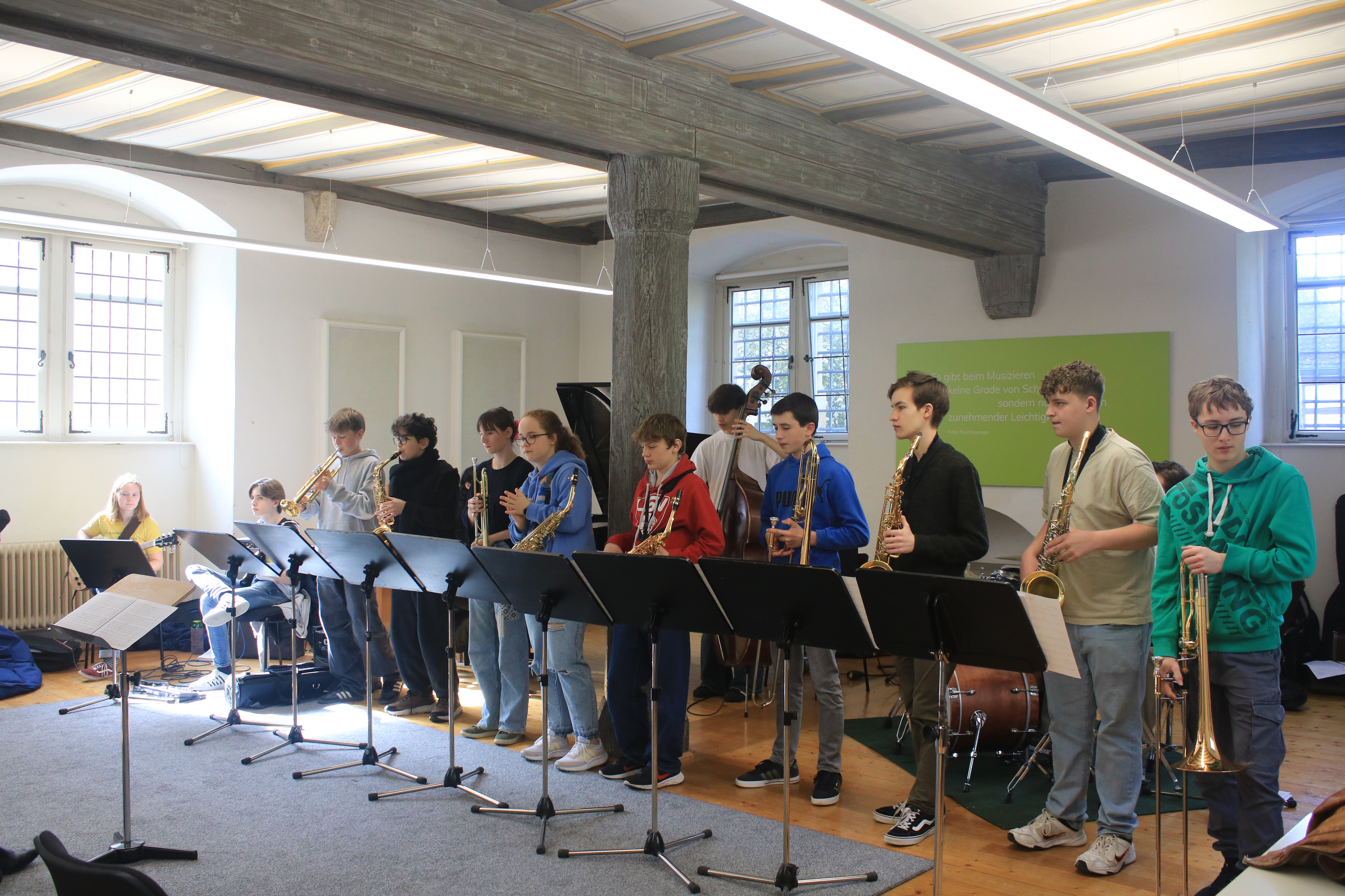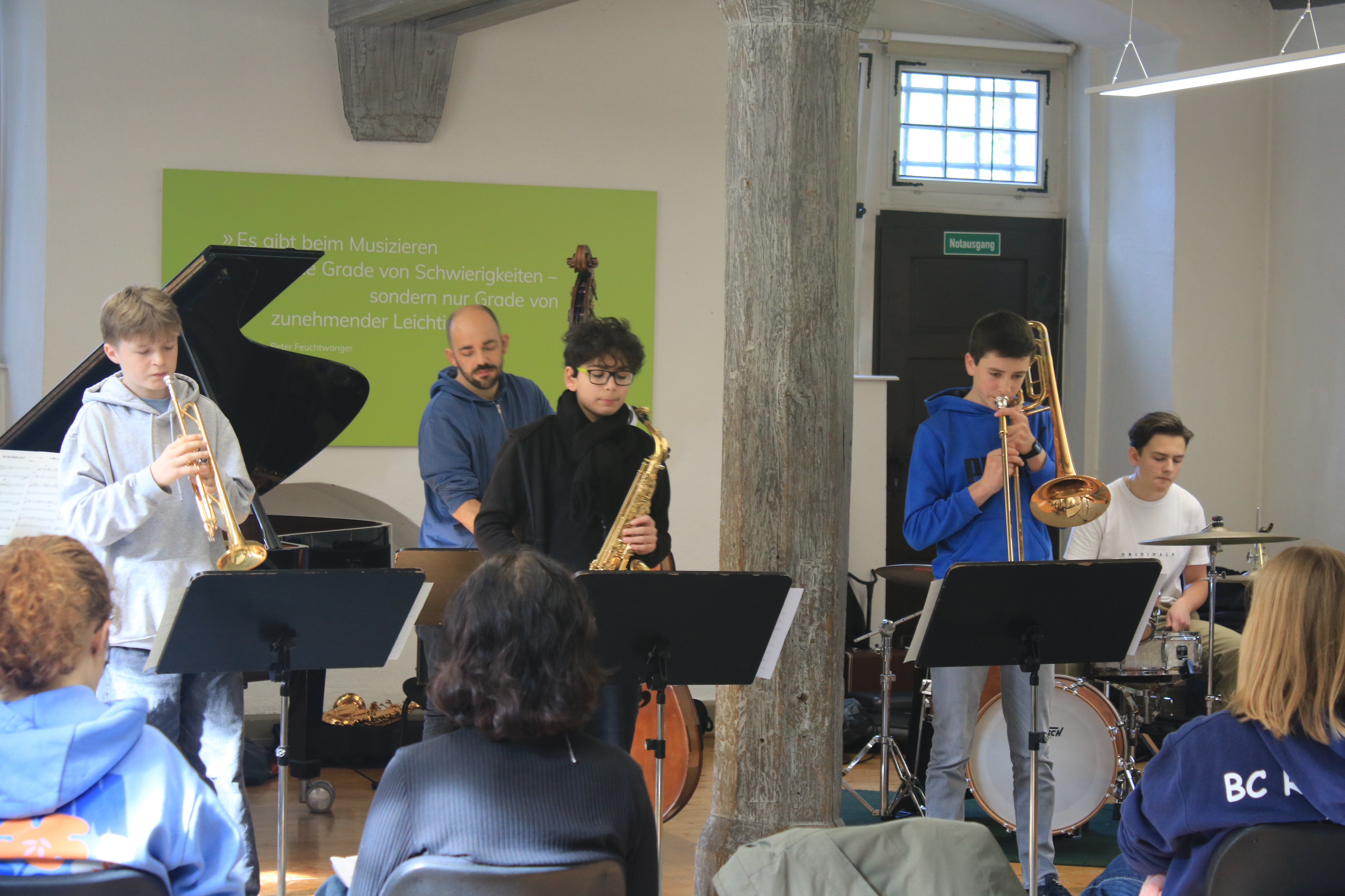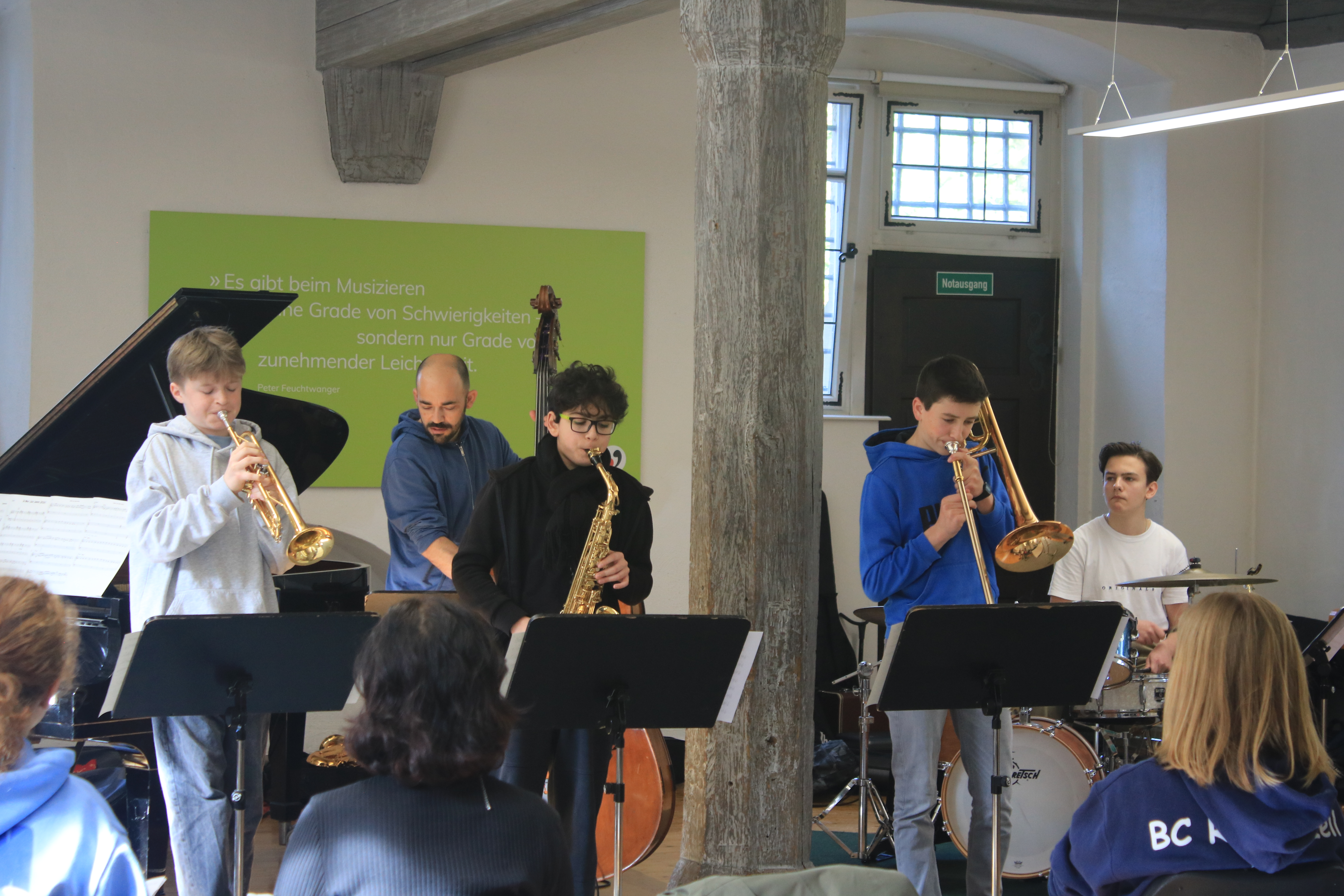 „Ich durfte dieses Jahr das erste Mal bei den Jazzjuniors dabei sein und es hat mir sehr viel Spaß gemacht. Besonders hat mir gefallen, mit anderen talentierten und jazzbegeisterten Jugendlichen Kontakte zu knüpfen und gemeinsam zu Jammen und an den Aufgaben zu wachsen. Die Dozenten waren allesamt super nett und haben uns viel beigebracht. Ein besonderes Highlight war das Jammen und Kennenlernen mit den Musikern des Lajazzo. Ich freue mich schon sehr auf die nächste Arbeitsphase.“ (April 2024)